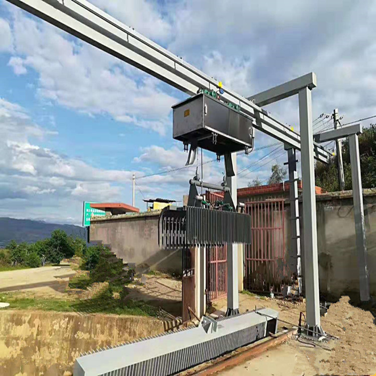 移動(dòng)式格柵清污機(jī)結(jié)構(gòu) 移動(dòng)式格柵整機(jī)包括格柵片、機(jī)架、工作平臺(tái)、行走機(jī)構(gòu)、清污機(jī)構(gòu)、翻耙機(jī)構(gòu)、垃圾小車、18kg/m輕軌、過(guò)載保護(hù)裝置、鋼絲繩防松裝置及行程控制、電氣控制箱。電源、驅(qū)動(dòng)執(zhí)行結(jié)構(gòu)和控制系統(tǒng)、電控箱等驅(qū)動(dòng)執(zhí)行結(jié)構(gòu)和控制系統(tǒng)位于機(jī)架上,同時(shí)為施工單位提供相關(guān)預(yù)留預(yù)埋件。